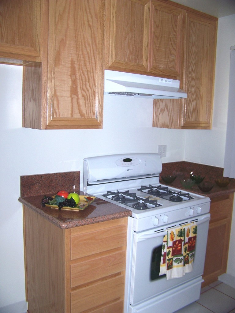 - Granite kitchen countertops and real wood cabinetry for a stylish, modern feel